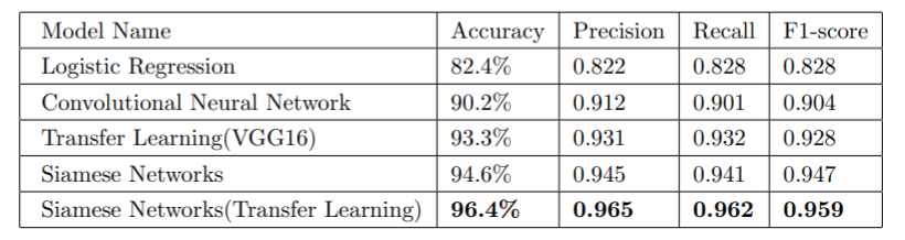 作者在前述数据集中执行了相关实验,在多个关键指标上实现了最优分类效果。孪生网络结合迁移学习展示了卓越的表现。