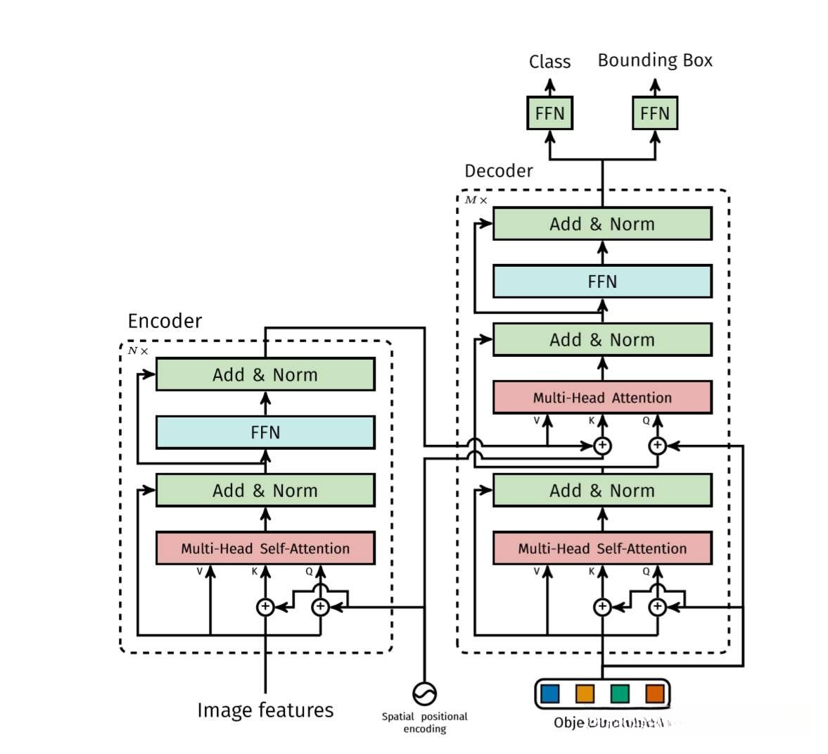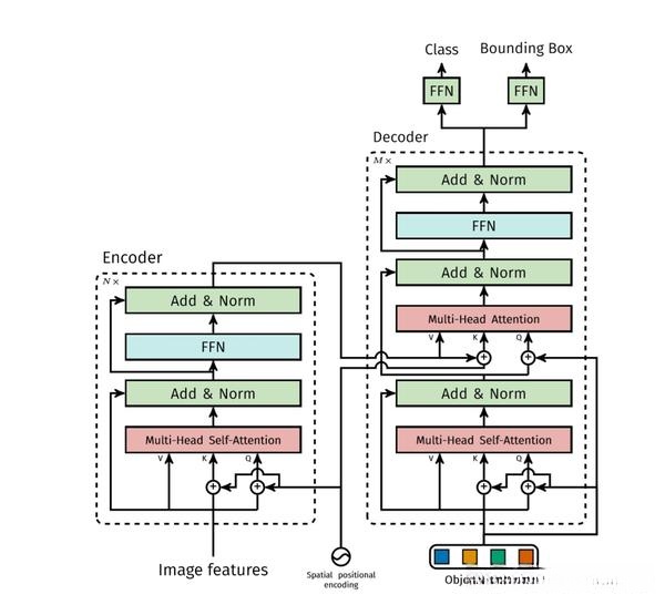 Transformer encoder 部分首先将输入的特征图降维并flatten,然后送入下图左半部分所示的结构中,和空间位置编码一起并行经过多个自注意力分支、正则化和FFN,得到一组长度为N的预测目标序列。其中,每个自注意力分支的工作原理为可参考刘岩:详解Transformer (Attention Is All You Need),也可以参照论文:https://papers.nips.cc/paper/7181-attention-is-all-you-need.pdf