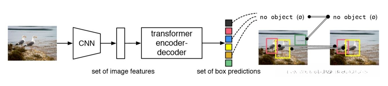 将目标检测任务转化为一个序列预测(set prediction)的任务,使用transformer编码-解码器结构和双边匹配的方法,由输入图像直接得到预测结果序列。和SOTA的检测方法不同,没有proposal(Faster R-CNN),没有anchor(YOLO),没有center(CenterNet),也没有繁琐的NMS,直接预测检测框和类别,利用二分图匹配的匈牙利算法,将CNN和transformer巧妙的结合,实现目标检测的任务。