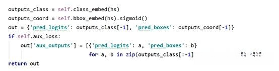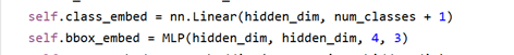 使用共享参数的FFNs(由一个具有ReLU激活函数和d维隐藏层的3层感知器和一个线性投影层构成)独立解码为包含类别得分和预测框坐标的最终检测结果(N个),FFN预测框的标准化中心坐标,高度和宽度w.r.t. 输入图像,然后线性层使用softmax函数预测类标签。