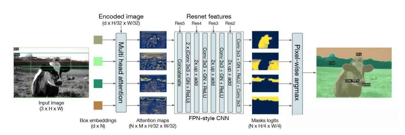为了展示DETR的扩展应用能力,作者还简单设计了一个基于DETR的全景分割框架,结构如下: