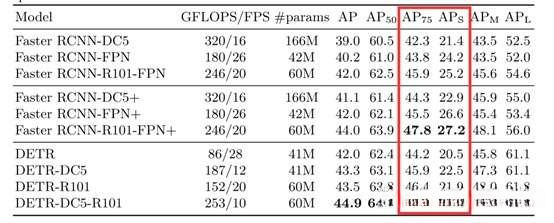 本文中,作者主要和目标检测经典框架faster rcnn进行了对比,结果如下(其中带有后缀DC5的方法表示在主干网络的最后一个阶段加入一个dilation,并从这个阶段的第一个卷积中去除一个stride来增加特征分辨率):