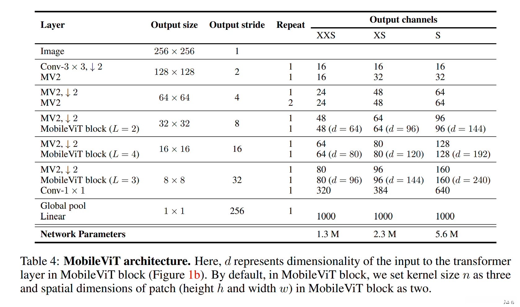 The MobileViT model is configured with L={2,4,3}, feature dimensions d={96,120,144}, and spatial resolutions of 32×32、16×16、and 8×8.
