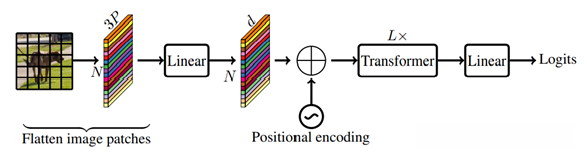 vit接收的图像数据具有H×W×C的空间维度,并通过重排形成N×PC形状后进行线性变换得到N×d维特征向量(其中P=h×w表示每个块的高度与宽度乘积,而N为分割成块的数量)随后经此变换后的特征向量被 fed 到 transformer 层进行序列建模运算