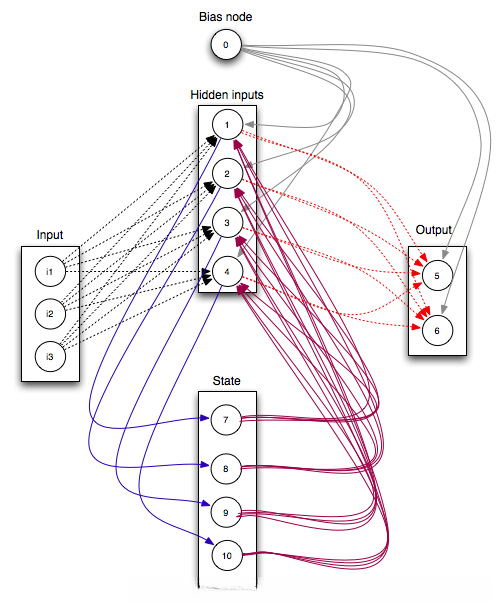 为了更加清晰理解,看第二个图,从神经元来看RNN,输入层有3个神经元,隐含层有4个神经元,输出层有2个神经元,保留当前时刻状态参与下一时刻计算。