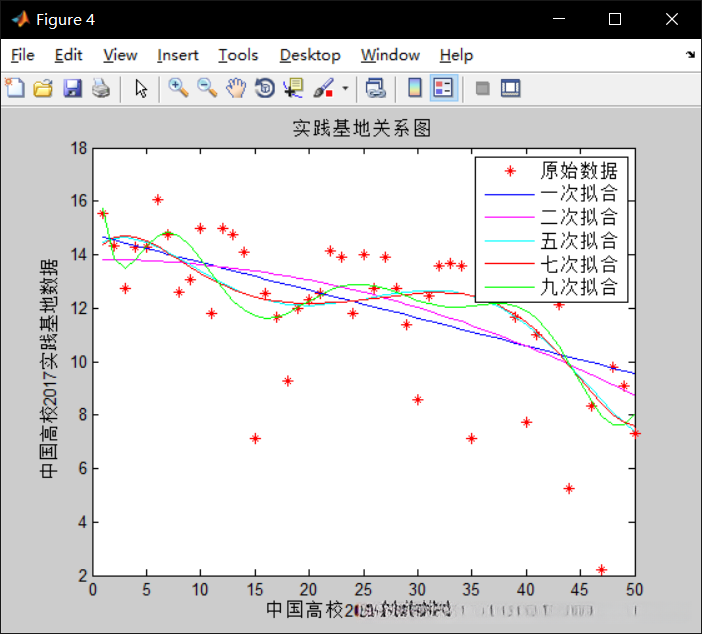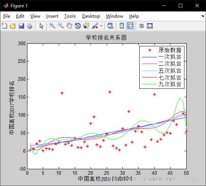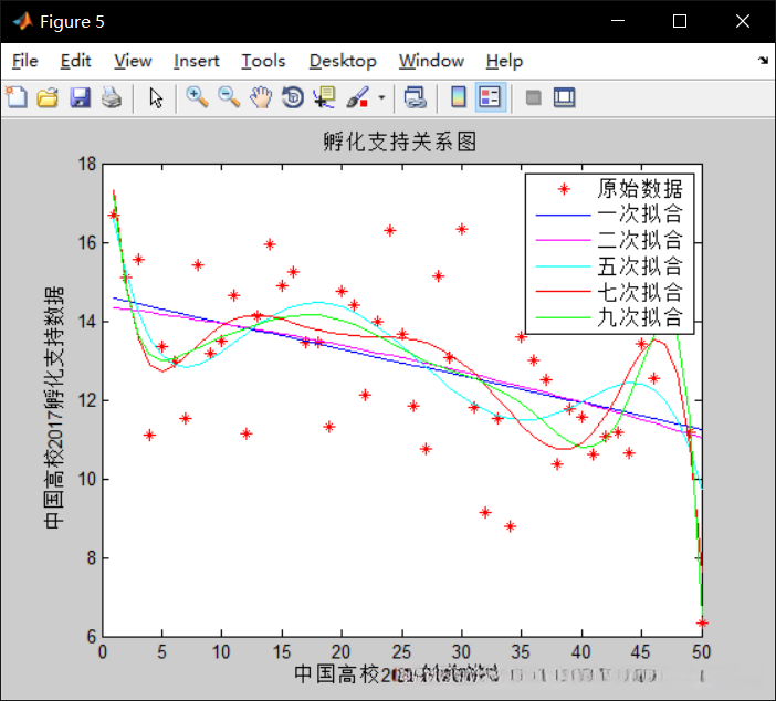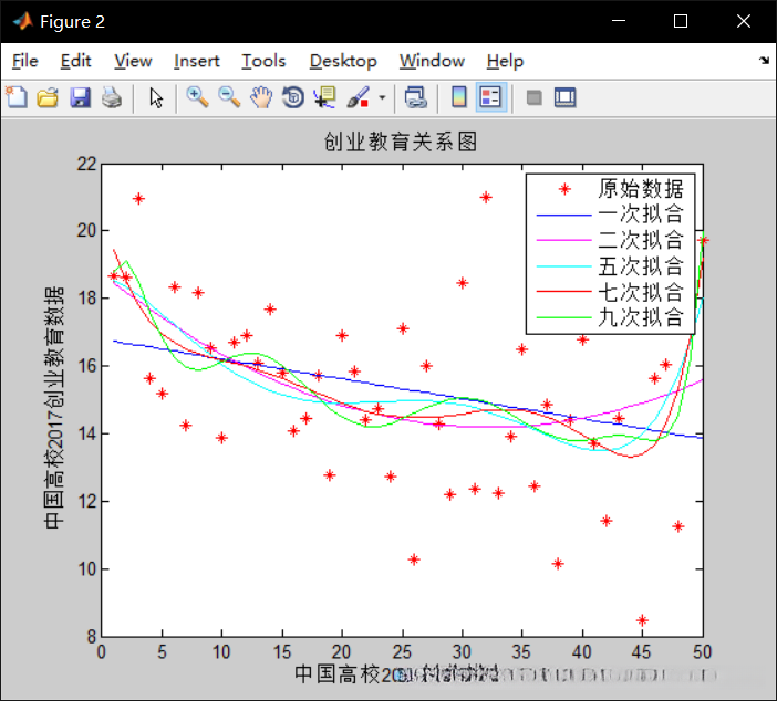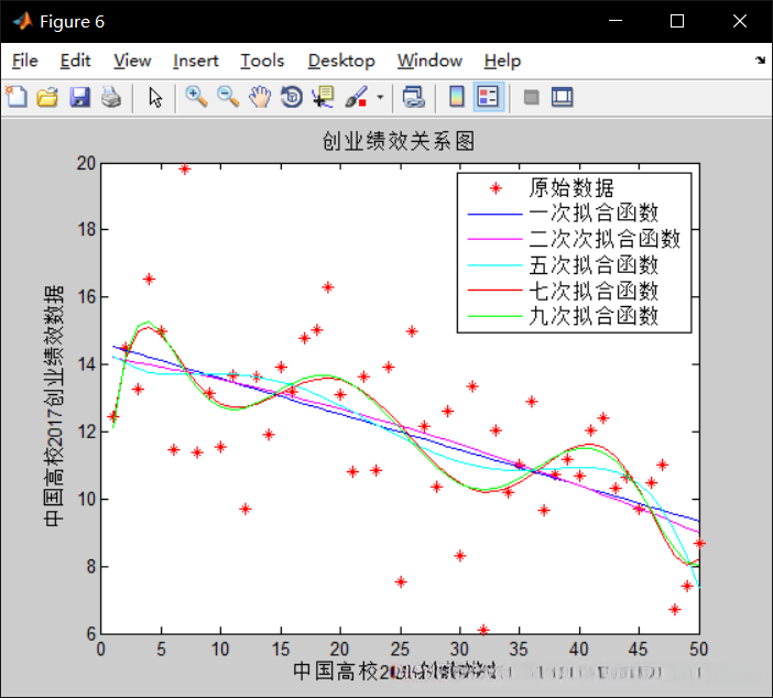 这是学校排名与高校创业排名的关系图,可以明显的看出,不管如何拟合,都有着创业排名高,学校排名也高的趋势,五次拟合效果较好,公式为