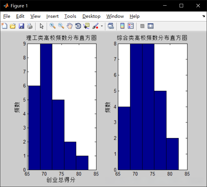 由理工类高校与综合类高校的创业总得分频数分布直方图可看出,综合类高校可能拥有着更高的创业分数,但总体来说在70至75分的表现相差无几,所以可以认为不管是理工类还是综合类高校的学生都有着创业发展的潜能,学校能否推波助澜才是问题的关键,不能因自己的学校性质寻找借口。