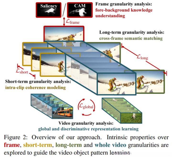 Key: 开发出一种无监督学习方案,并基于四个维度展开特征提取。相当于多个代理任务的集合,具体涵盖帧级(frame)、短时(short-term)、长时(long-term)以及全程视频粒度(whole video granularity)的任务