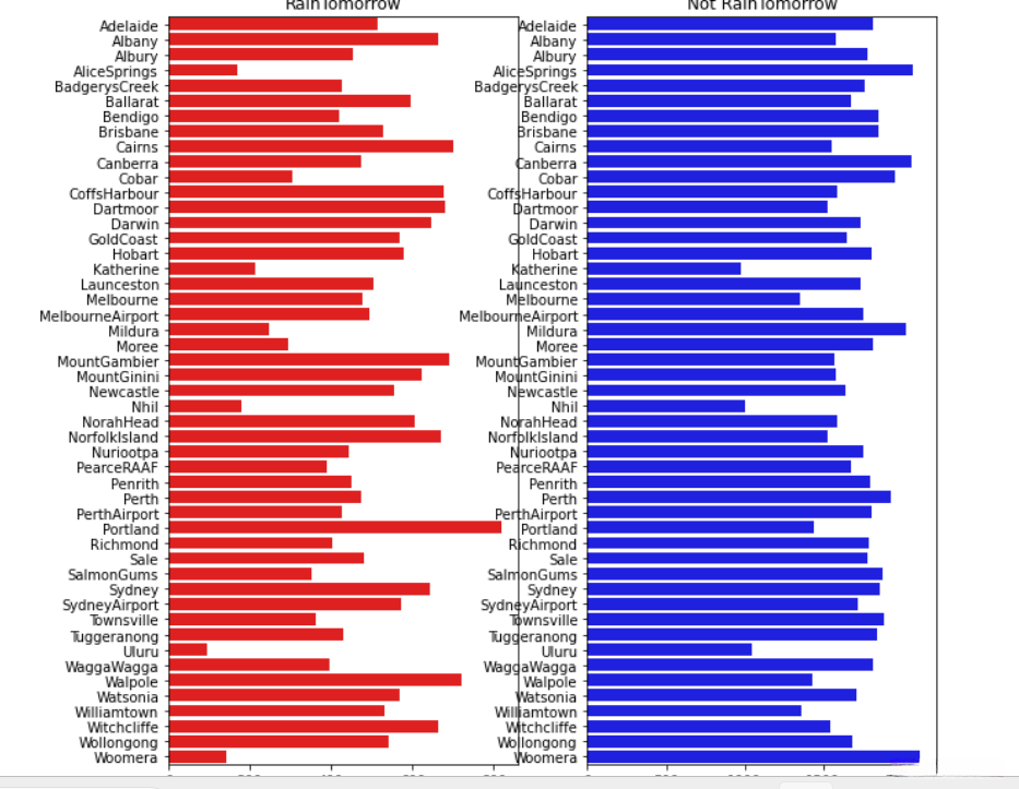 sns.barplot(x = pd.DataFrame(tlog['RainToday'][:2]).sort_index()['RainToday'], y = pd.DataFrame(tlog['RainToday'][:2]).sort_index().index, color = "red")