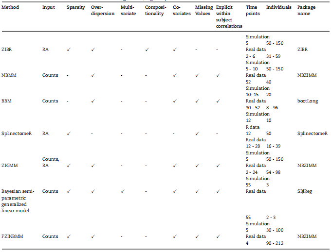 ZIGMM的主要优点是能够模拟受试者内样本之间的时间依赖性效应和相关性。 此外,该方法可以包括正态分布和零相关模型的各种固定效应和随机效应。该方法还可以解释样本之间不同的自回归相关结构。最后,该方法可以分析微生物组比例数据以及扩增子或宏基因组测序技术生成的计数数据。然而,ZGMM也遇到了控制假阳性率的拟合问题,特别是在分析复杂数据(包括宏基因组学)时。