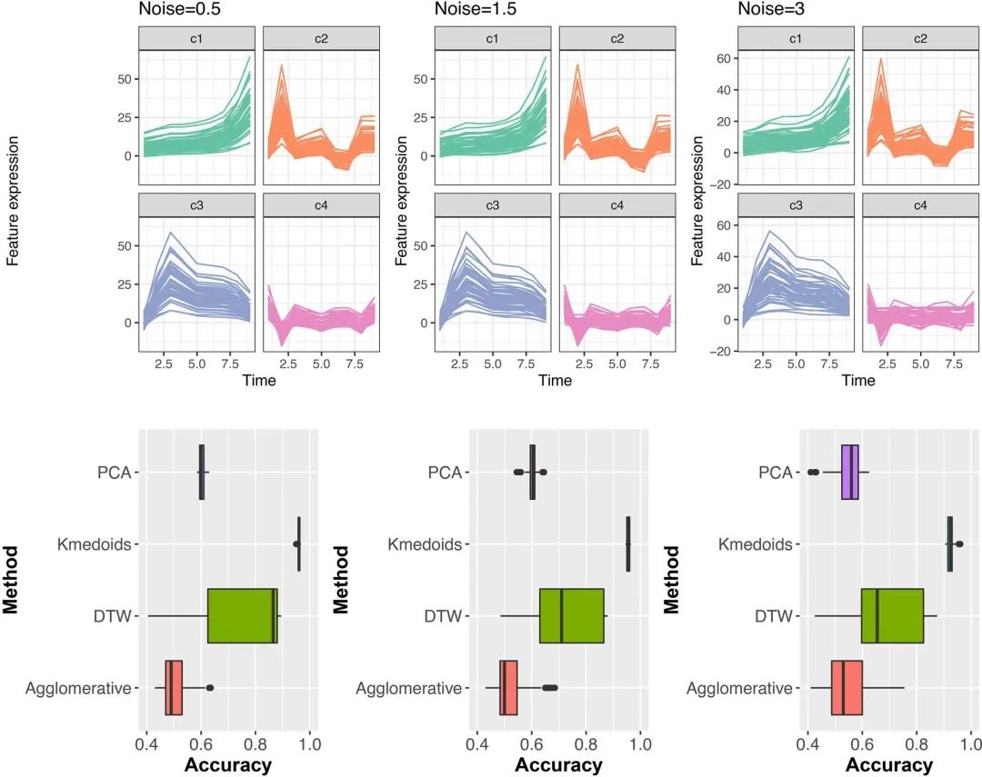 研究团队模拟数据以评估聚类方法的性能: 与其他聚类方法(即PCA、DTW、层次聚类)相比,k-medoid聚类的中值聚类精度最高。然而,正如预期的那样,随着噪声水平的增加,所有方法的聚类精度都会降低。k-medoid聚类、DTW和层次聚类都具有相似的中值聚类精度,但DTW在其精度上具有很高的可变性。