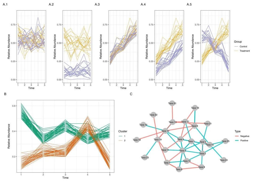 2)对具有类似时间丰度模式的微生物进行分组。 这种分析往往要求我们首先对每种微生物的时间轨迹进行建模。