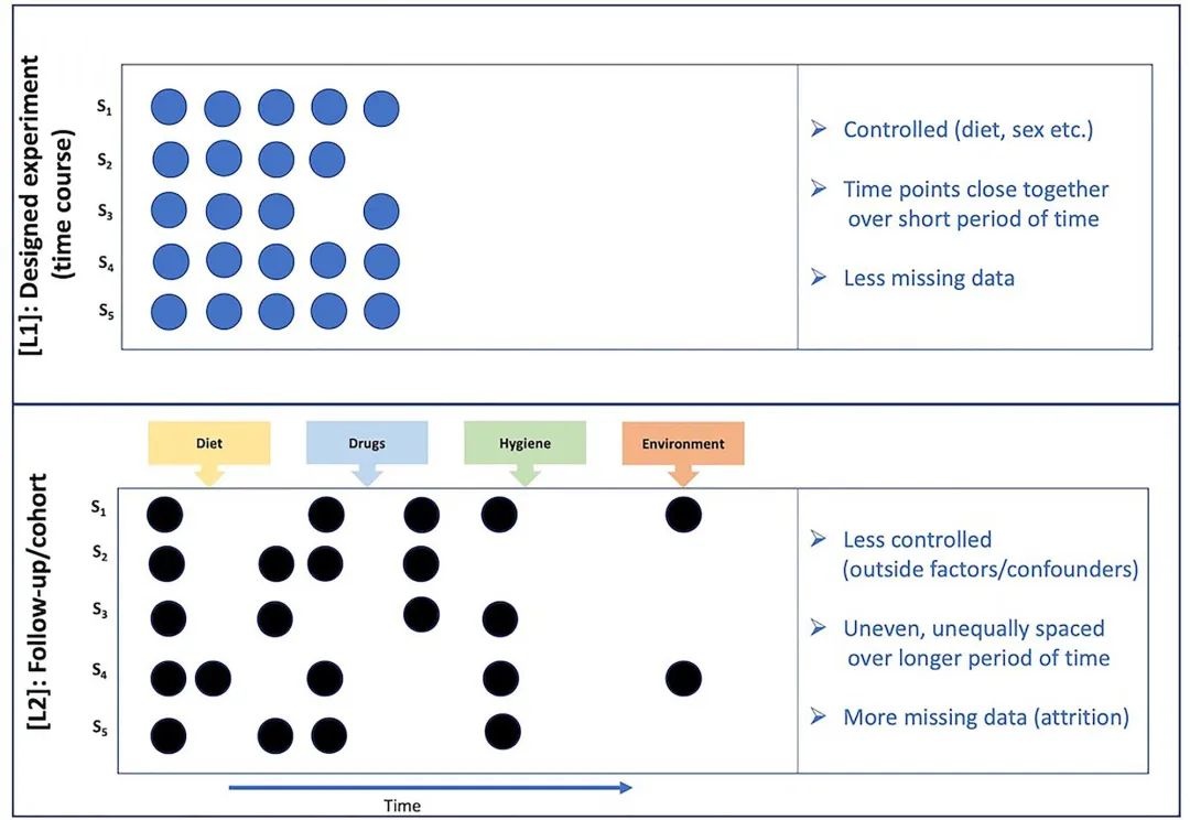 纵向微生物组数据通常来自两种不同的情况:来自设计实验(如小鼠)[L1]和人类随访或队列研究[L2]。对于L1类纵向数据,时间点通常比L2研究紧密,每个受试者的时间点数量相同(或非常相似)。相比之下,L2类数据通常具有受试者时间点数量不均匀和时间点间隔不均匀的特点。此外,在L2研究中,一些外部因素(如饮食)也可能影响微生物组,但可能经常无法测量或不受控制,这使得建模更具挑战性。