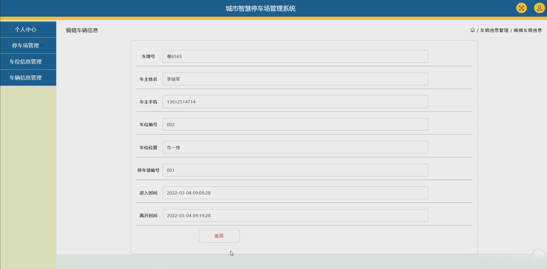 - 停车位信息管理:基于实时数据动态更新与呈现停车位空间布局及资源状态(空闲/占用),辅助车主精准识别可用停车位并完成预约登记。