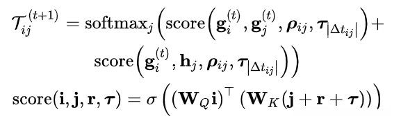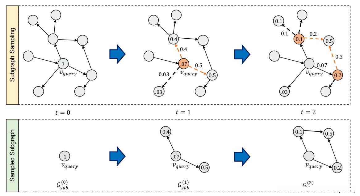 最初,查询节点的权重值是1,其他实体都是0,之后,在步骤t,权重流传播边权重