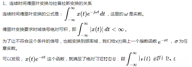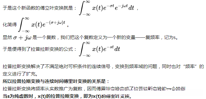由此可见, 拉氏变换由此而产生于傅里叶分析的基础上; 他通过在傅里叶积分公式中引入一个双重权重因子(双肩因子), 从而使得原本能量发散的信号也能够实现有效的时频域转换。