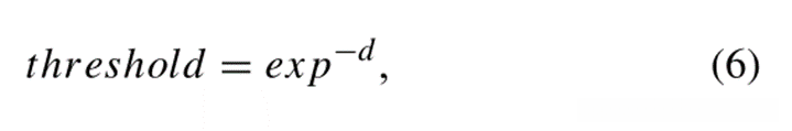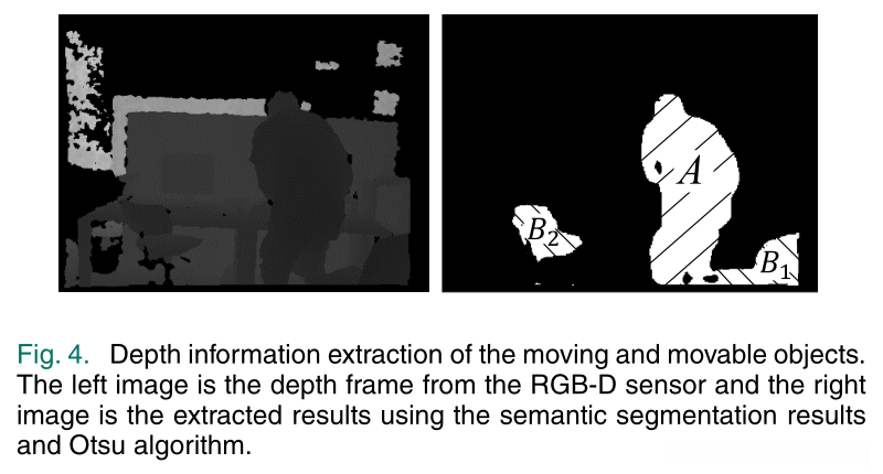 右图像是使用Otsu方法提取的区域。我们使用每个提取对象的平均深度分别计算A和B1、A和B2区域之间的深度差。深度差的两个值被转换为(6),以生成相应的阈值。利用衰减函数来模拟深度差与阈值之间的关系,可以看作是阈值的自适应选择。也就是说,移动对象和可移动对象之间的深度差越小,可移动对象越可能是动态的。
