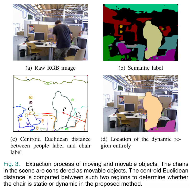 例如,在图3.d中,我们将C1和P之间的质心距离表示为C1P,将C2和P之间距离表示为C2 P。如果C1 P大于其相应的阈值,则左侧的椅子估计为静态。如果C2P小于其相应的阈值,则右侧的椅子被估计为动态的。