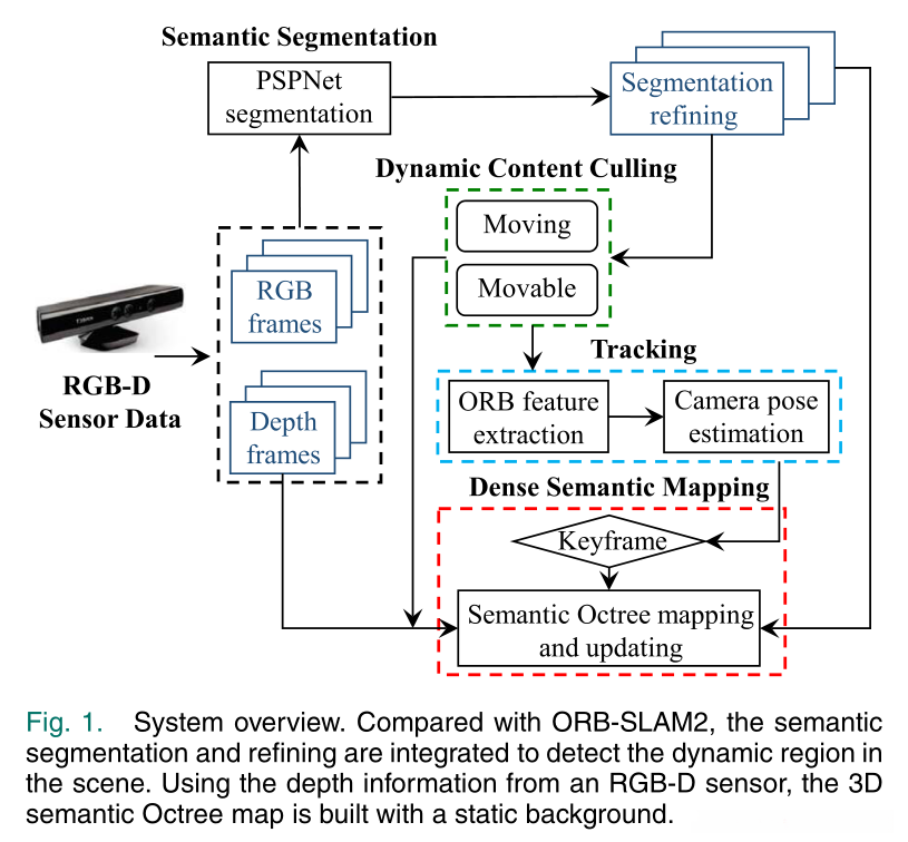 RS-SLAM系统在ORB-SLAM2的基础上主要增添了动态内容剔除和密集语义映射两个模块。