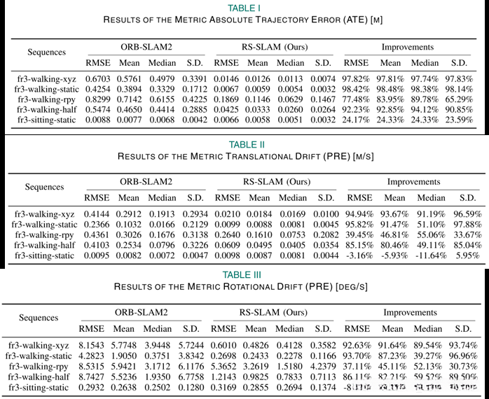 对于ATE,RS-SLAM算法的平均RMSE提高了91.49%,标准差(SD)提高了88.03%,表明RS-SLAM算法具有较好的鲁棒性和稳定性。结果表明,在动态场景下,该方法可以显著提高SLAM性能。