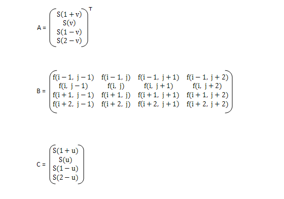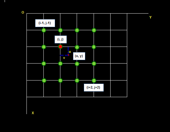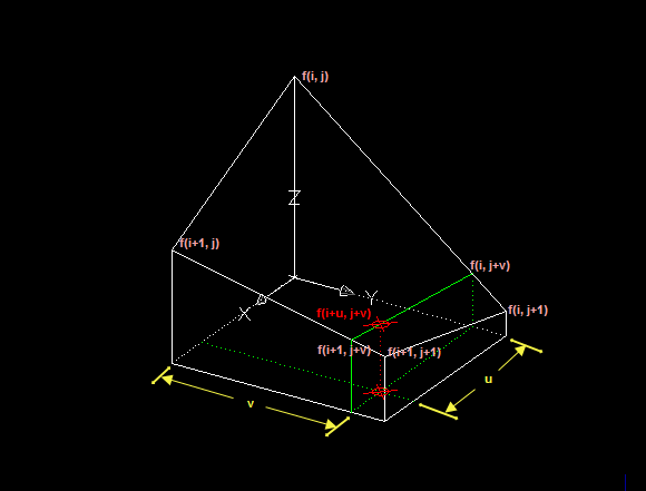 f(i+u, j+v) = (1-u) * (1-v) * f(i, j) + (1-u) * v * f(i, j+1) + u * (1-v) * f(i+1, j) + u * v * f(i+1, j+1)