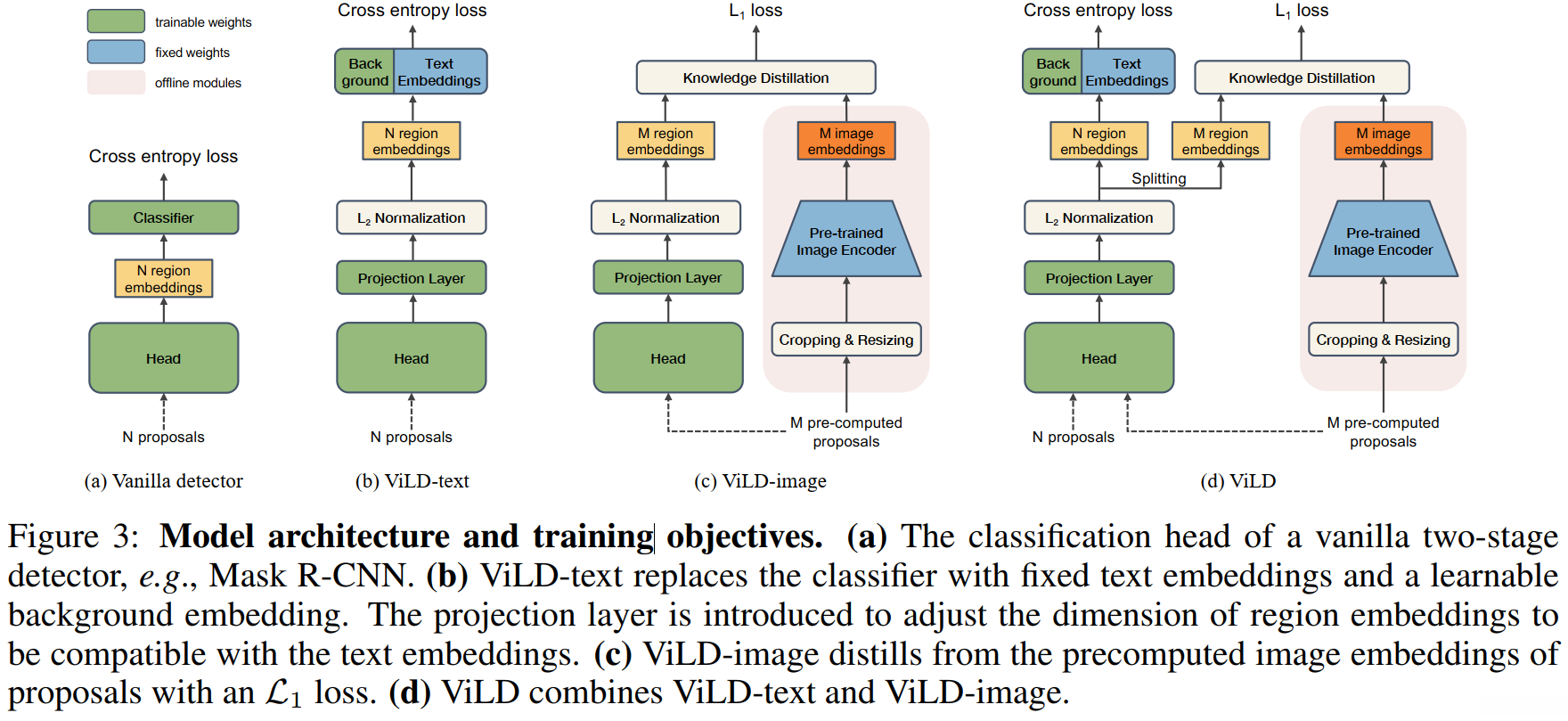 在这项工作中,我们考虑借用预先训练的开放词汇分类模型的知识来实现开放词汇检测。我们从R-CNN(Girshick等人,2014)式的方法开始。我们把开放词汇检测变成两个子问题:1)广义物体提议和2)开放词汇图像分类。我们使用基础类别中的例子训练一个区域提议模型。然后,我们使用预先训练好的开放词汇图像分类模型对裁剪后的物体提议进行分类,这些提议可以包含基础类别和新类别。我们以LVIS(Gupta等人,2019)为基准,将所有罕见的类别作为新的类别,将其他类别作为基础类别。令我们惊讶的是,新类别的性能已经超过了其监督的对应类别。 然而,这种方法对于推理来说是非常缓慢的,因为它将对象建议逐一送入分类模型。为了解决上述问题,我们提出了ViLD(视觉和语言知识提炼)来训练两阶段的开放词汇检测器。ViLD由两部分组成:用文本嵌入(ViLD-text)和由开放词汇图像分类模型推断的图像嵌入(ViLD-image)学习,例如CLIP(Radford等人,2021)。在ViLD-text中,我们通过将类别名称输入预训练的文本编码器来获得文本嵌入。然后,推断出的文本嵌入被用来对检测到的区域进行分类。类似的方法已经被用于之前的零散和开放词汇检测工作(Bansal等人,2018;Rahman等人,2018;Zareian等人,2021)。我们发现与视觉数据共同学习的文本嵌入可以更好地编码概念之间的视觉相似性,与从语言语料库学习的文本嵌入相比,例如GloVe(Pennington等人,2014)。使用CLIP文本嵌入在LVIS上实现了10.1APr(新类别的AP),大大超过了使用GloVe的3.0APr。在ViLD-image中,我们通过将对象建议输入预训练的图像编码器来获得图像嵌入。然后我们训练一个物体检测器,其检测到的方框的区域嵌入与这些图像嵌入相一致。与ViLD-text相比,ViLD-image从基础和新的类别中提炼知识,而ViLD-text只学习基础类别的概念。我们表明,从文本和图像嵌入中共同学习的ViLD在LVIS上取得了16.1的APr,比有监督的对应方高出3.8。为了突破性能极限,我们使用ALIGN(Jia等人,2021)作为更强大的教师模型,并获得了26.3APr的最佳性能,这比使用额外技巧的2020年LVIS挑战赛冠军(Tan等人,2020)仅差3.7APr。我们还在COCO(Lin等人,2014)上获得了最先进的结果。我们的方法比之前的SOTA(Zareian等人,2021年)在新的类别上的表现要好4.8AP,在所有类别上的表现要好11.4AP。此外,在LVIS上训练的ViLD可以直接转移到其他检测数据集,包括Objects365、COCO、PASCAL VOC。