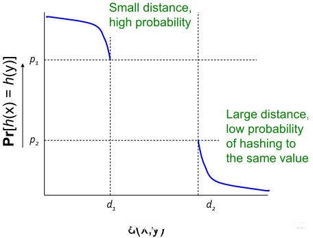 2)如果d(x,y) ≥ d2, 则h(x) = h(y)的概率至多为p2;