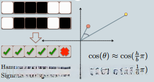 基于上图所示,在编码过程中仅需6bits即可表示两个数据点。这正是原始数据经过LSH处理后的哈希值。它们的哈希签名仅有一位差异;因此其海明距离为1;基于其长度计算,则可据此计算两向量之间的夹角余弦相似度