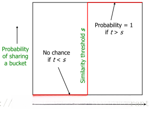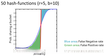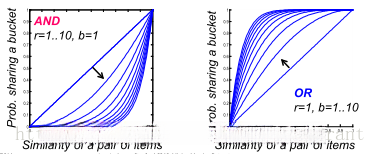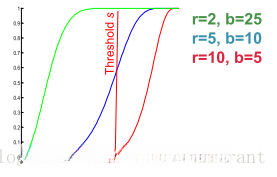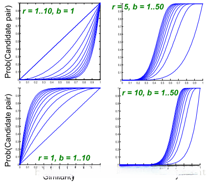 假设存在b个bands, 每个band包含r rows, 并设定其Jaccard similarity系数为s, 则这两篇特定的文档被映射至同一个hash bucket的概率即为: