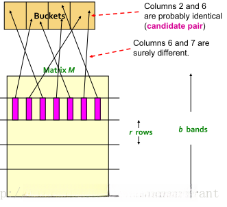 通过minhash算法生成的signature矩阵被划分为b个带状块, 每个带状块包含r行数据.随后, 使用哈希函数将每个带状块中的每一列映射到一个非常大的哈希表中.只要哈希表中的桶数量足够多, 从而导致地址冲突的概率非常低.