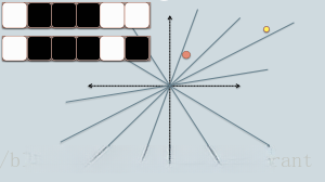 在图中展示了红色圆圈和黄色圆圈这两个元素群组来表示二维空间中的数据点集合。随后通过LSH方法计算这些数据点对之间的余弦相似度作为衡量标准。随后随机生成了一组垂直超平面将这些数据集进行分割处理。具体而言若某数据点位于该超平面之上区域则赋予其0值对应白色标记否则赋予1值对应黑色标记这样的二进制分类方式能够有效地区分不同类别间的差异特征进而生成一个二进制特征向量来表征原始数据的空间分布情况