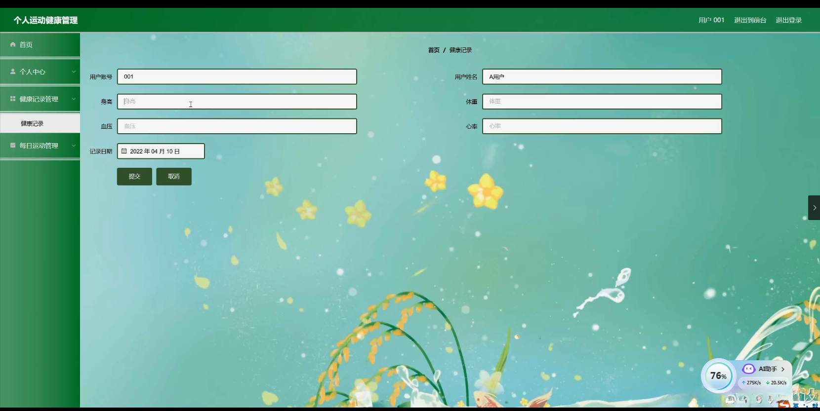 个人运动健康管理系统涵盖多个功能,本研究内容围绕这些系统功能展开。