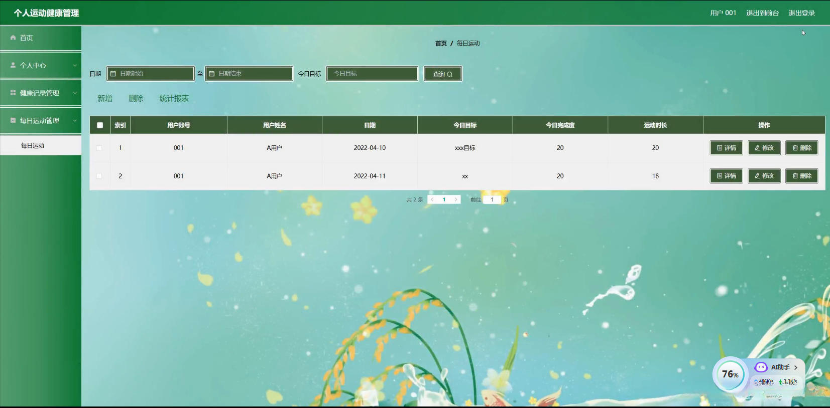 - 现实意义 :在现实生活中,能够帮助个人更好地管理自己的健康。通过个性化的运动、饮食、睡眠等方面的管理,可以提高个人的健康水平,预防慢性疾病,提升生活质量。同时,也可以为健康管理相关产业(如健身行业、健康餐饮行业等)提供更精准的服务方向,提高产业效益。 [1]
