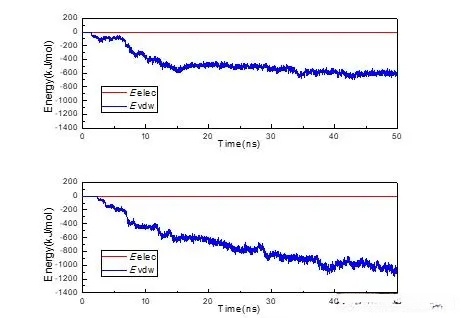具体的实验步骤如下:首先进行体系在真空环境下的能量优化计算。具体而言,在采用最陡下降法的基础上完成2500步优化过程;随后切换至共轭梯度法继续优化2500步。每一步的截断阈值均设定为10 Å以避免原子间过近接触;同时设定能量收敛标准为100 kJ·mol⁻¹·nm⁻¹以确保优化精度。完成能量优化后开展位置限制性动力学模拟:在此过程中需限制大分子中原子的位置自由度;允许溶剂分子在其运动空间中自由活动。其中水分子的平均驰豫时间为10 ps;因此本研究中设定系统的平衡时间为1000 ps。整个模拟过程包含两个阶段的能量平衡阶段:首先通过升温过程将体系温度从初始状态(绝对零度)逐步提升至标准实验室温度(298.15 K);随后在恒温恒容条件下施加约1000 kJ的压力增量以实现系统的压力平衡(压力目标值设定为标准大气压强)。最终在恒温恒压条件下完成压力和温度的同时调节过程以获得稳定的结果状态。经过上述所有准备步骤后:随后对系统展开长达50 ns的时间片采样模拟;其中每隔10 ps记录一次构象信息;通过Gromacs内置工具以及VMD软件对模拟结果进行可视化分析
