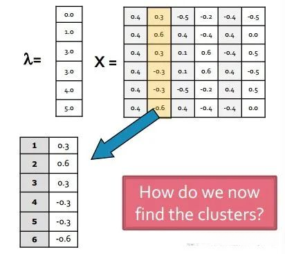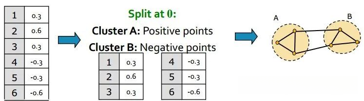 - 分解:计算拉普拉斯矩阵的特征值和特征向量,其中第二小特征值为