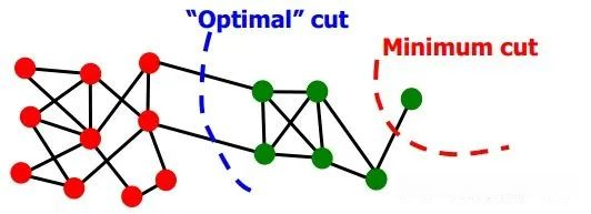 但是,在试图最小化 cut 的时候存在一个问题:如图所示,在某个节点度数为 1 的情况下切割这条边会使 cut 达到 1 的值;然而这并不是最优的划分结果;直观上来说应该是用蓝色线条来表示的划分方案才是最优解。