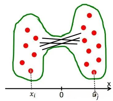 则x必定同时具有正负值(如图所示),在坐标轴两侧分布着一些数据点,在谱聚类算法中我们期望最大化同一类内的连接数量的同时最小化不同类别之间的连接数量即尽量减少数据跨越零点的可能性从数学表达式上讲我们希望