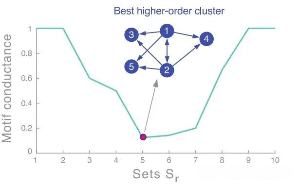 评估各个划分下的motif conductance值,并选取具有最低motif conductance值的划分方案(如图所示)。其中参数r设置为5时取得最优效果。