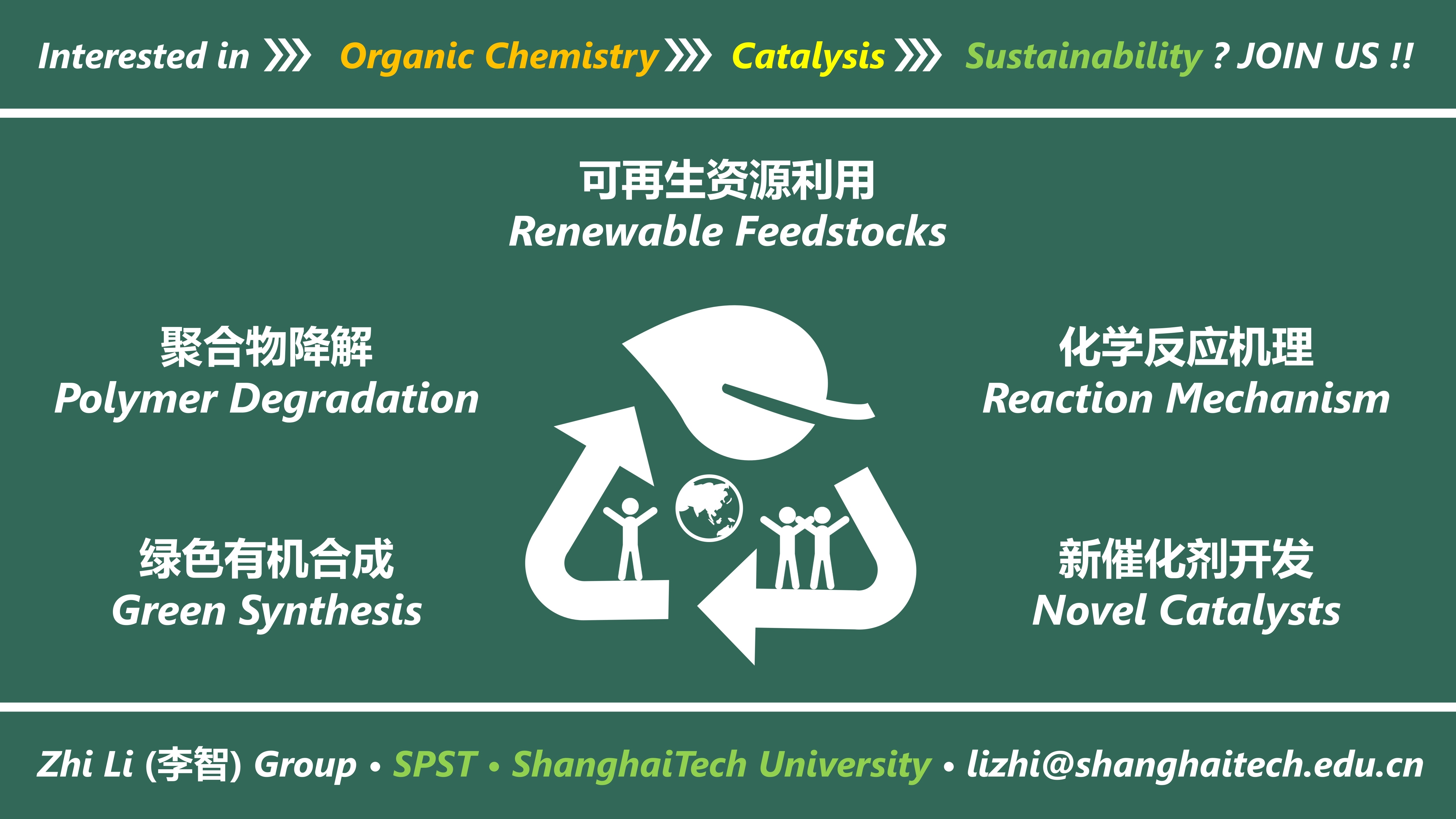 | 本课题组长期诚聘博士后研究员、硕博连读研究生,待遇优厚、课题前沿、工作环境优越,欢迎有志于在有机化学、催化化学等领域开展最先进研究的学生学者加入!有意者请直接与李智邮件联系。 |
