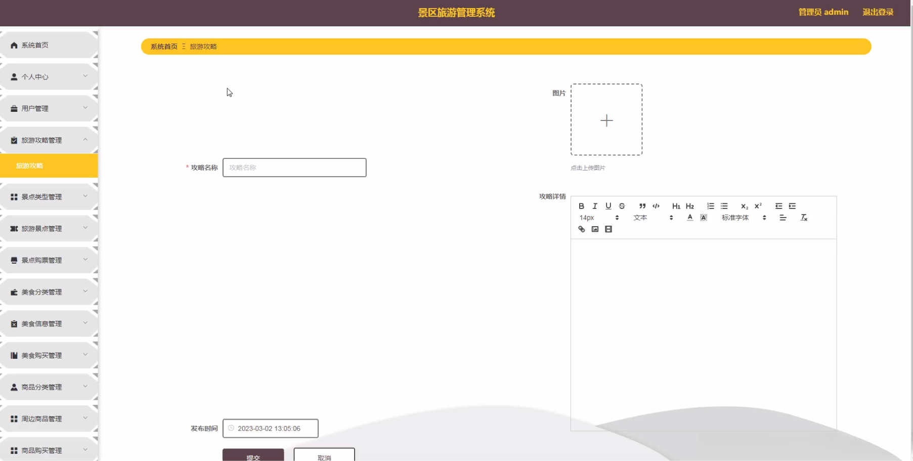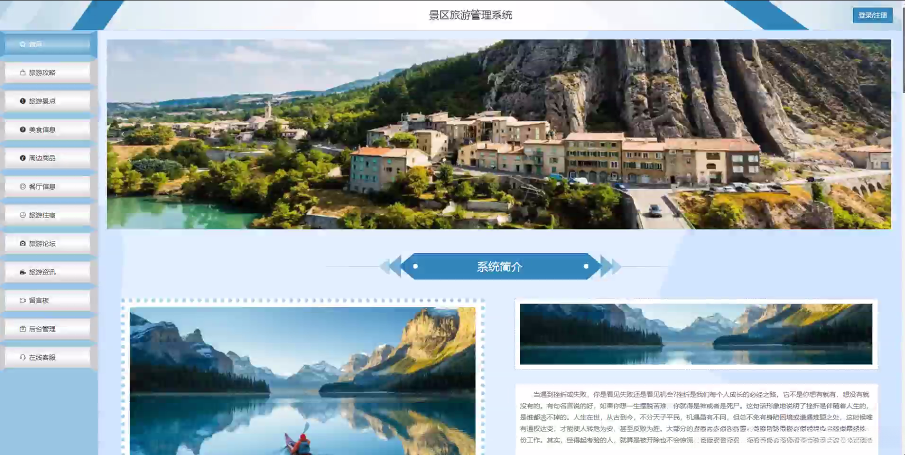 本研究的主要目的是设计并实现一套功能完善、易于扩展的景区旅游管理系统。该系统需具备用户管理、旅游攻略发布、景点及住宿信息查询、美食推荐及预订、景点购票、住宿预定、商品购买及评价等多种功能。通过该系统,游客可以轻松获取所需的旅游信息,享受便捷的旅游服务;同时,景区管理者也能够实现对旅游资源的有效管理和数据分析,从而提升景区的管理水平和游客满意度。