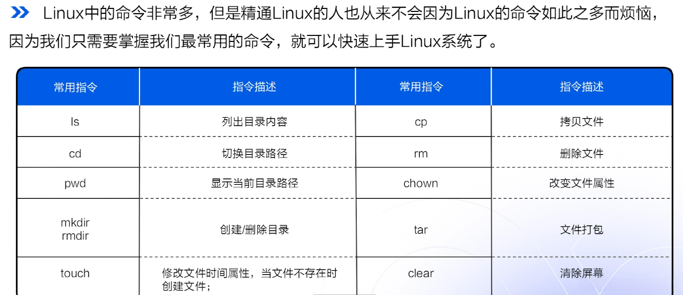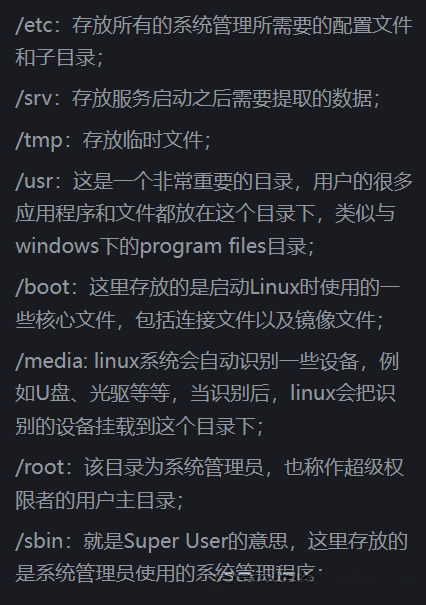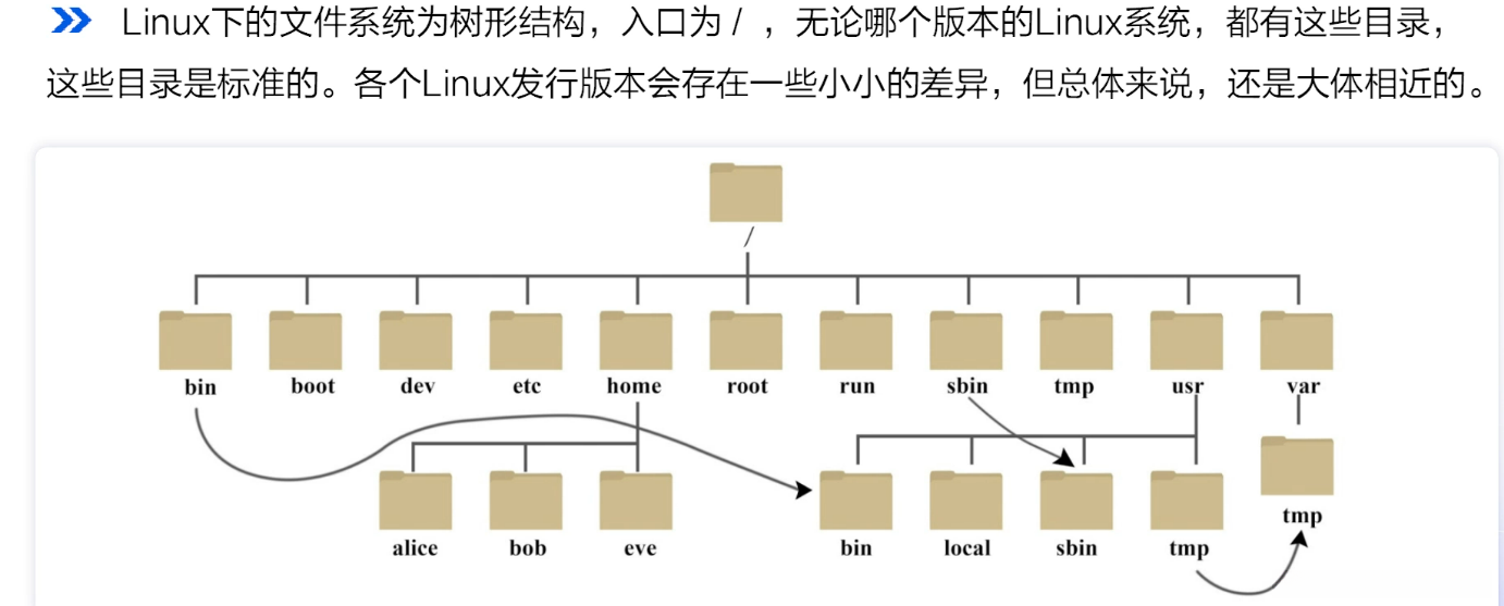 (2)Linux的文件系统为树形结构,如图所示,入口为 / 反斜杠,代表根目录,根目录下包含了与开机、系统文件、函数库等相关的核心文件,例如/bin文件中存放了大多数的系统命令、/boot中存放了与开机相关的文件。
