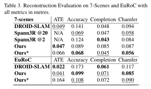 密度几何评估:作者在EuRoC Vicon房间序列和7-Scenes序列中对MASt3R的几何重建结果进行了评估,并与其他算法进行了比较。结果显示,MASt3R在7-Scenes序列中的准确率和Chamfer距离等指标上优于其他算法,而在EuRoC序列中虽然在ATE(绝对轨迹误差)指标上不如DROID-SLAM,但在几何准确度上却更优。
