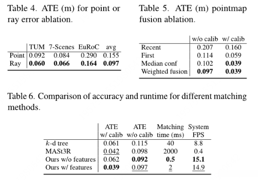相机位姿估计:作者在TUM RGB-D、7-Scenes、ETH3D-SLAM和EuRoC等多个数据集上评估了相机位姿估计的RMSE(均方根误差),并与其他算法进行了比较。结果显示,MASt3R在所有数据集上都取得了最先进的轨迹误差结果,并且在没有使用校准信息的情况下也能够实现高精度的相机位姿估计。