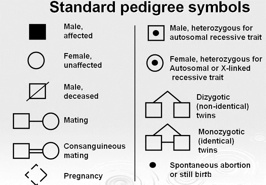 21. Pedigree chart (谱系图):A chartshowing the genetic connections between individuals. 显示个体之间基因联系的图表。