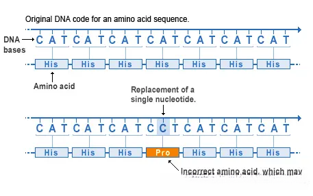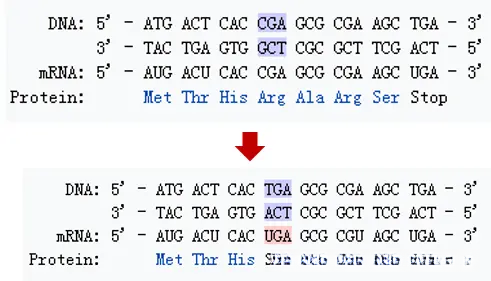 **25. Missense mutation (错义突变):**A point mutation in which a single nucleotide change results in a codonthat codes for a different amino acid. 一种点突变,其中单个核苷酸的变化导致编码不同氨基酸的密码子的改变。会改变蛋白质序列,一般发生在遗传密码子的第一位或第二位。
