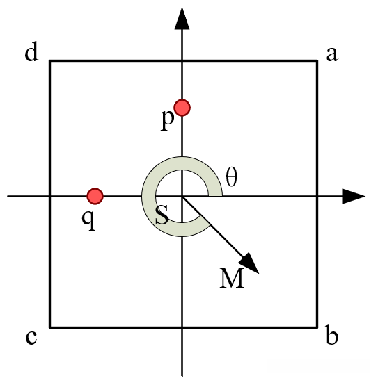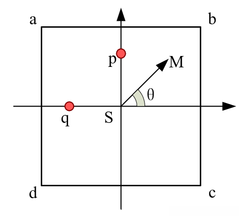 下一步就是要考虑如何计算BRIEF描述子了,我们希望描述子可以具有旋转不变性。BRIEF描述子的本质是:在关键点附近随机得选择一些点对,比较他们的像素值,定义当以第一个点像素点较大则记为“1”,反之为“0”。因此只需要一串二进制数据就可以存储大量信息。这里我们先看一种错误情况,首先用abcd标注图像方向,这里选择p、q两点计算一位BRIEF描述子信息,注意这里的p、q一定是相对S选择的,比如p的坐标大概是(0,n),q的坐标大概是(-m,0),而二者在实际图像下的坐标就需要加上关键点S的坐标(x,y),设此时θ=45°刚好指向b方向。