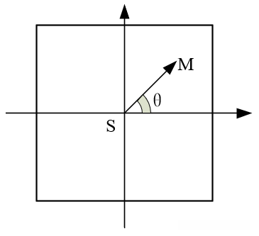 这里要注意的是,质心的是指以所选的关键点为中心构建的正方形区域的质心,为了得到质心与特征点坐标之间的角度θ,而且得到夹角可以理解为以关键点为原点,以x轴正方向为起点,逆时针旋转的角度,这里可以根据m10和m01的正负判断。S为关键点,M为质心,如下图: