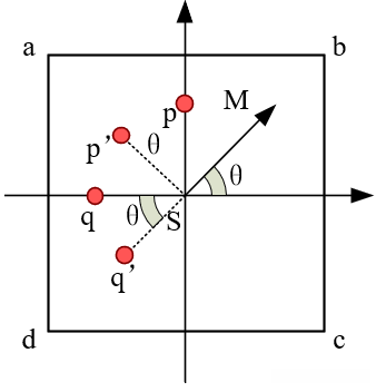 再看一下顺时针旋转90°的情况,同样是旋转θ角度。由于是逆时针旋转θ,也就是顺时针旋转2π-θ角, 得到此时的p'、q'两点,此时可以发现此时p’相对S的方向指向a,q’指向d。也就是说此时p'、q'相对S的位置是不变的,也就具有了旋转不变性。