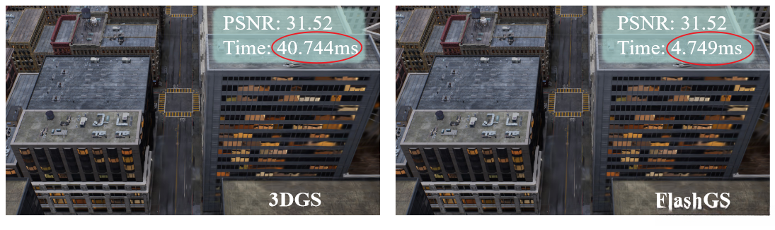 We propose FlashGS, enabling real-time rendering of largescale and high-resolution scenes.