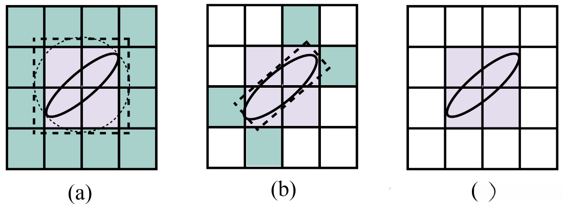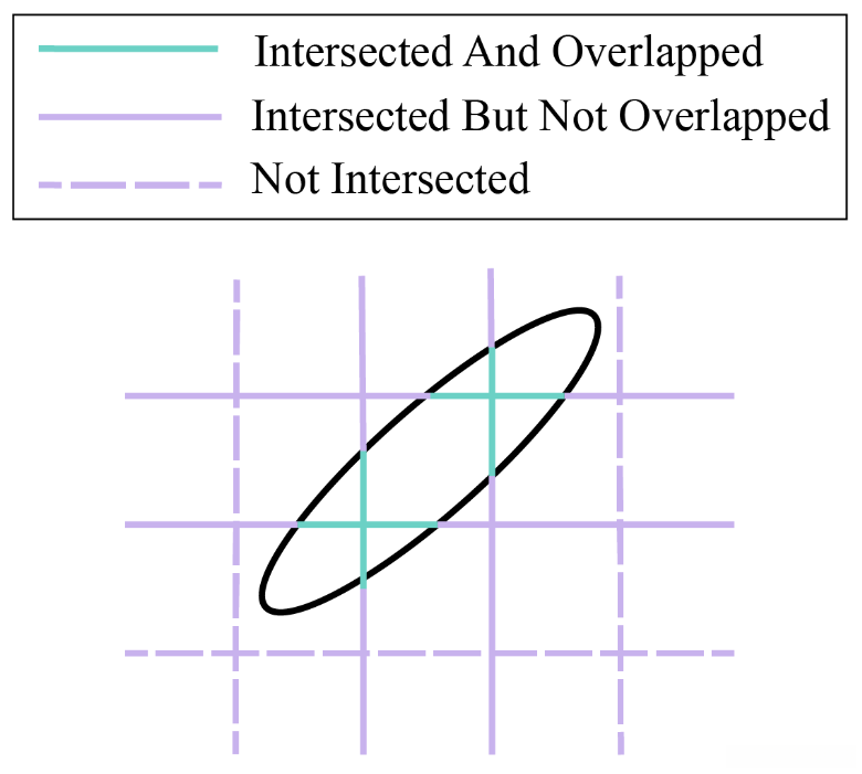 (purple represents the real intersection tiles, green shows the tiles each method treats as intersected, and white means not).